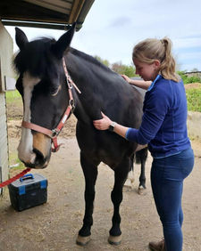 Myofascial release helps to lengthen fascia, break down fascial adhesions, allow tissues to glide over eachother, re-establish the normal electrical charge of cells, and promote improved circulation. Horses will show signs of of release by licking, chewing, yawning and relaxing.